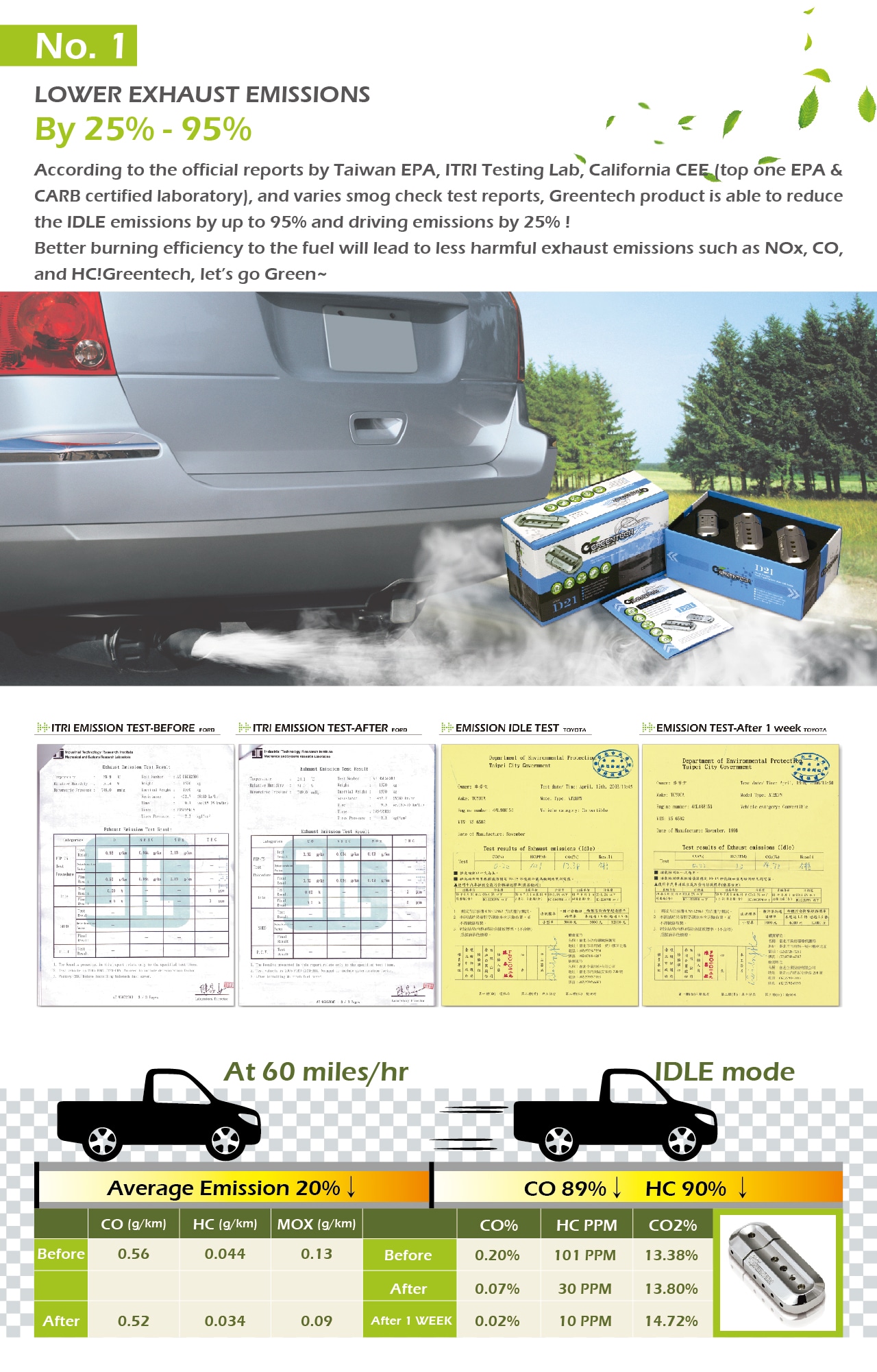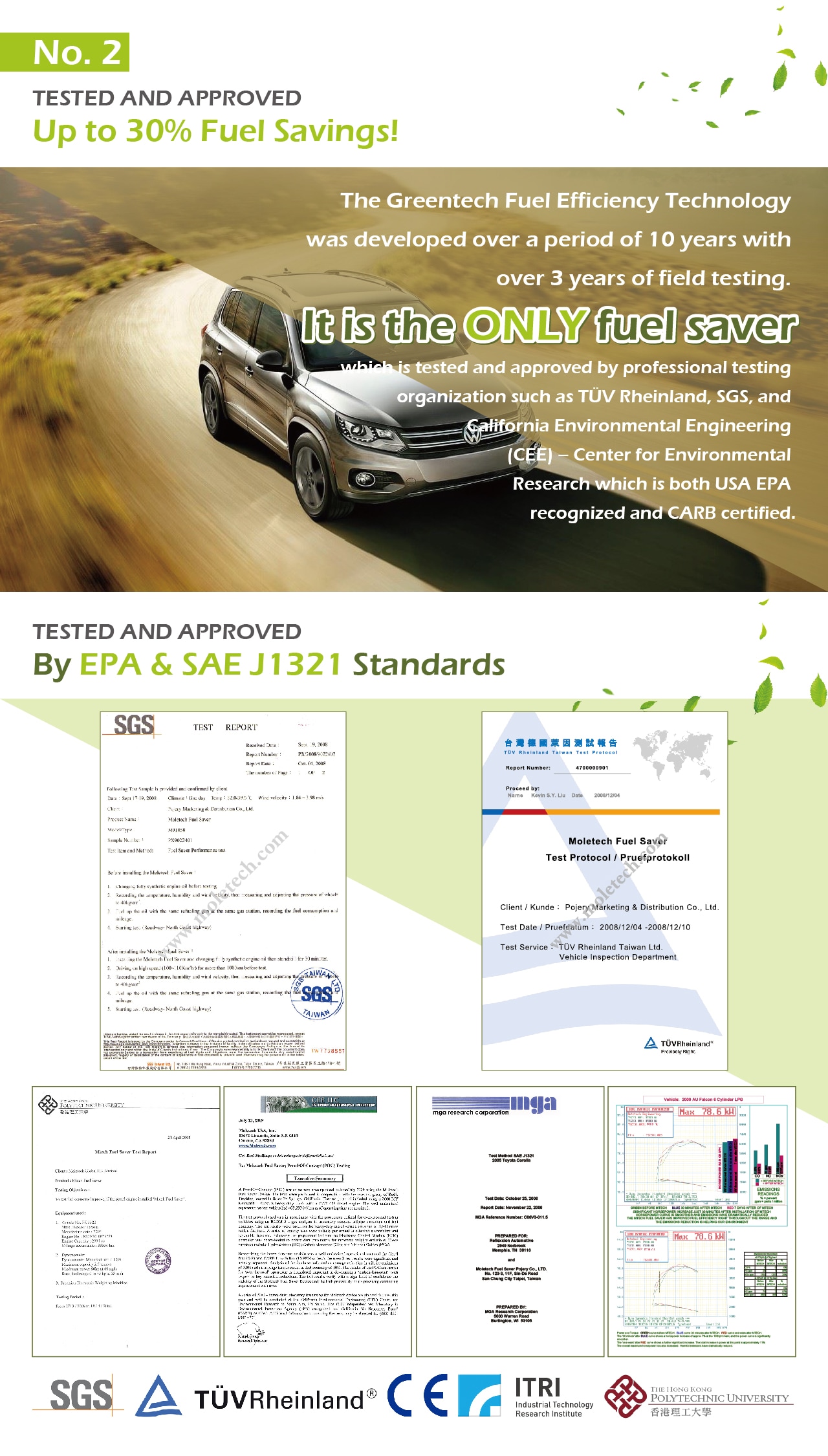 1. Tested by TUV, SGS, California CEE2. Save up to 15% on petrol