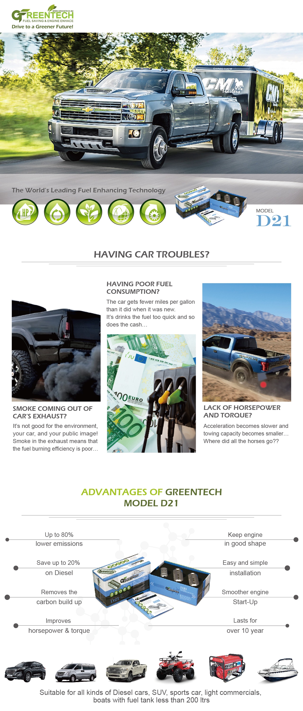 Greentech fuel saver "G11" is suitable for all kinds of petrol/gasoline cars and trucks the tank capacity is less than 100 liters (26 gallons).