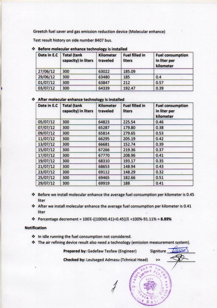 Greentech Fuel Saver applies molecule technology to break the van der Waals force between the gasoline molecules and change the aggregation of molecules from larger molecule clusters to smaller ones or even single molecules. Molecule technology is a physical reaction and does not contain any chemicals or catalysts. It can reduce fuel consumption and emissions, increase horsepower and torque, and help the engine run smoother. According to research and testing studies, the surface tension of the treated fuel was decreased; causing the smaller droplets, exposing larger surface area in the air, contact with oxygen for better combustion reaction, and hence, better fuel efficiency.